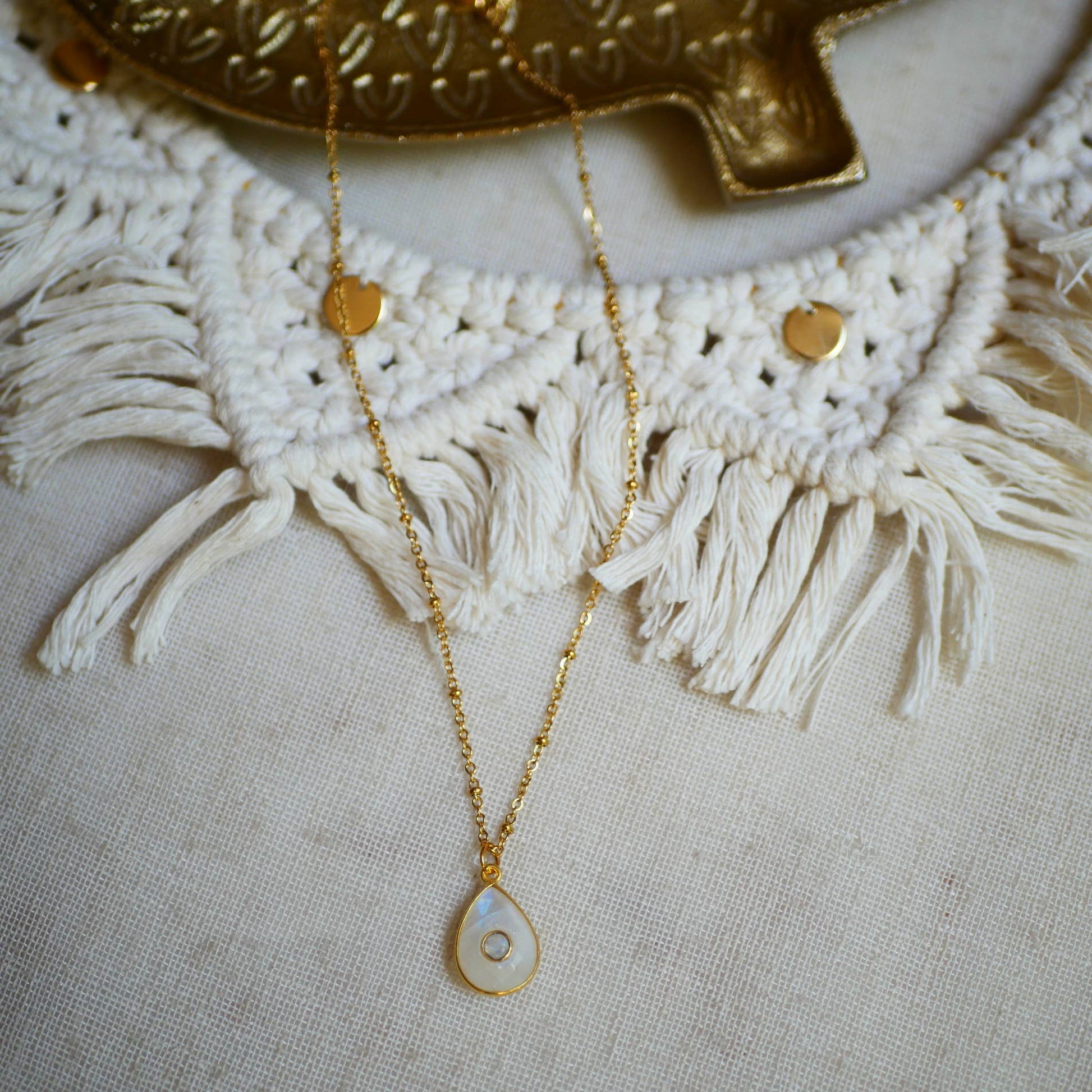 Aus Edelstahl gefertigt, ist sie mit einem tropfenförmigen Regenbogen-Mondstein und einem kleinen Regenbogen-Mondstein in der Mitte verziert. Der Mondstein bringt emotionale Klarheit und stärkt die Intuition.